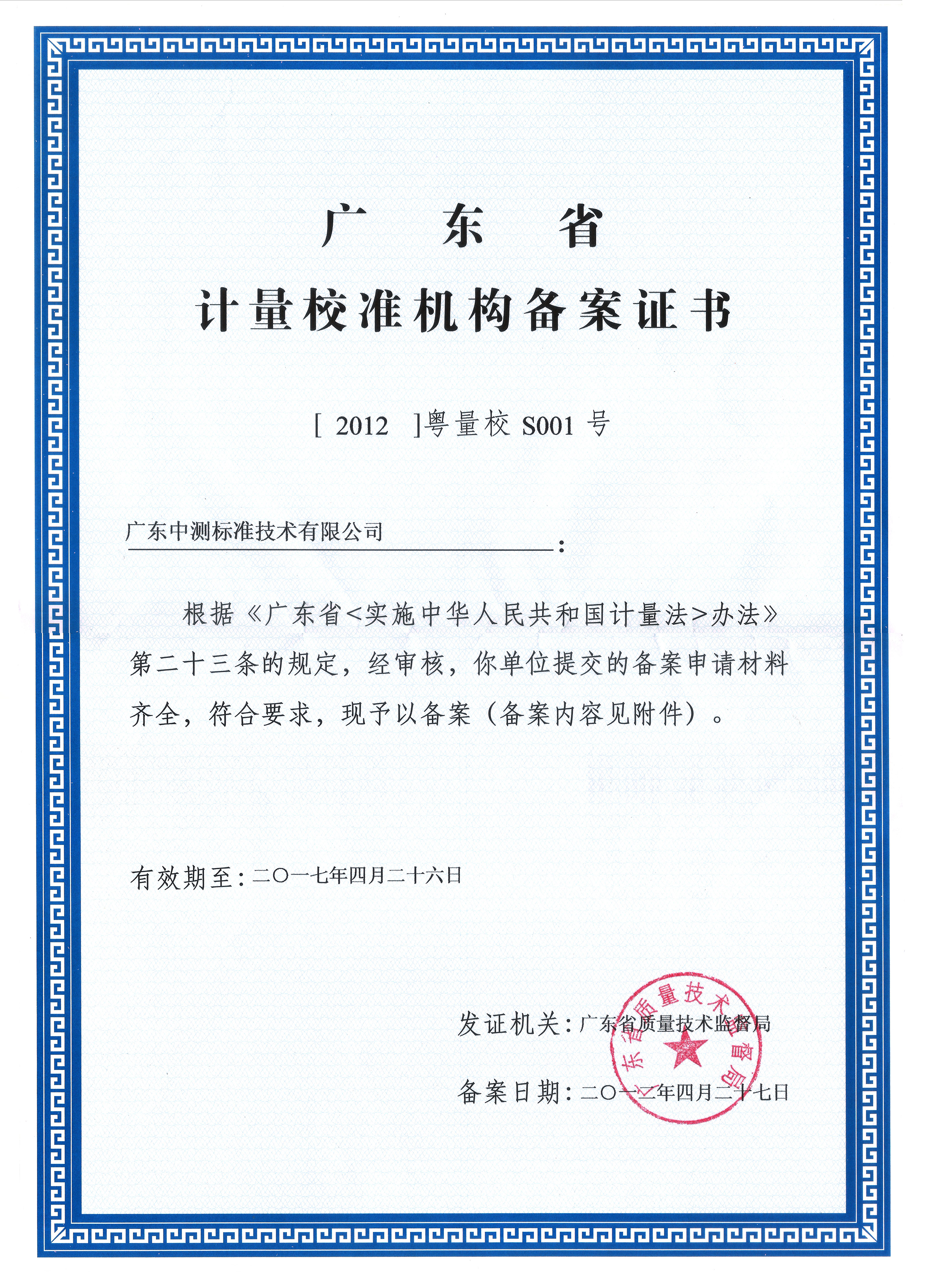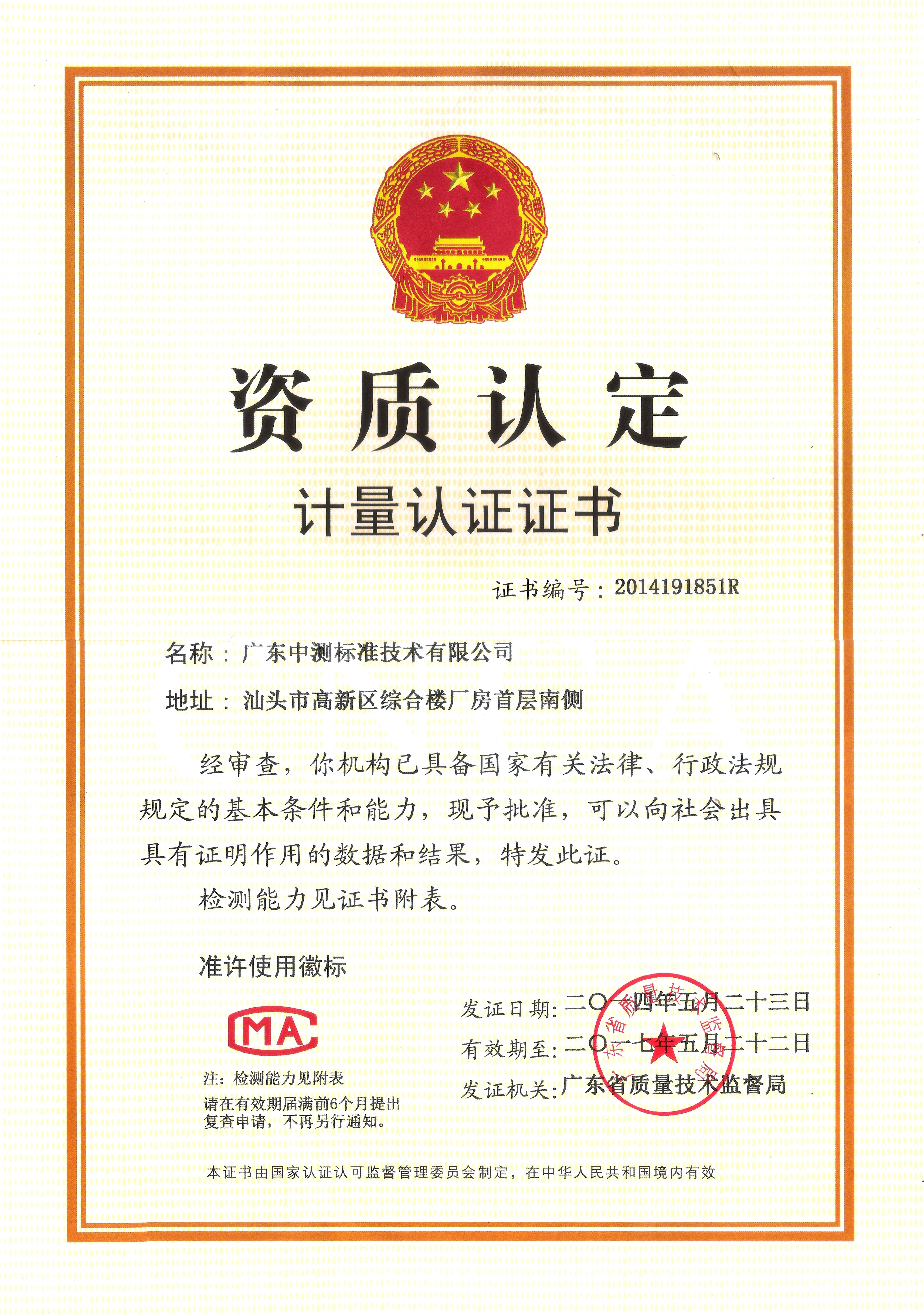 广东中测标准技术有限公司是具有独立法人资格,经广东省质量技术监督局等政府职能部门严格资格审查和资质认定,获得计量认证即CMA资质认定计量认证的技术服务检测机构,并在消防监督管理部门备案,接受消防部门检查、监督及业务指导。本公司以第三方形式为社会各界提供公正、可靠,具有证明作用的数据及结果的报告和证书。同时,广东中测也是自《广东省<实施中华人民共和国计量法>办法》颁布后,广东省第一个取得计量校准机构备案证书([2012]粤量校S001号)的第三方检测、校准实验室。